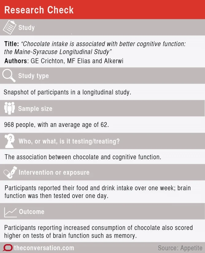 This is a correlational study. That means it shows an association between people who reported regularly eating chocolate and better scores on brain function tests. It doesn’t show that chocolate consumption directly improves brain function.