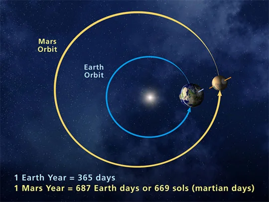 In other words, a Martian year is almost 700 days long, which works out to being 1.88 times as long as a year on Earth. This means that every time Mars completes a single orbit around the Sun, the Earth has gone around almost twice. During the moments when they are on opposite sides of the Sun, this is known as a “conjunction”. When they are on the same side of the Sun, they are at “opposition”.