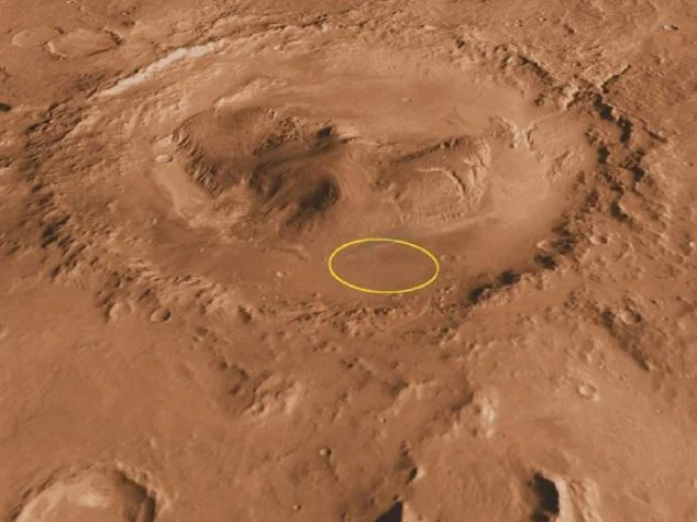 An oblique image of Mt. Sharp inside Gale Crater on Mars. The yellow ellipse is Curiosity’s landing spot. - Image Credit: NASA/JPL