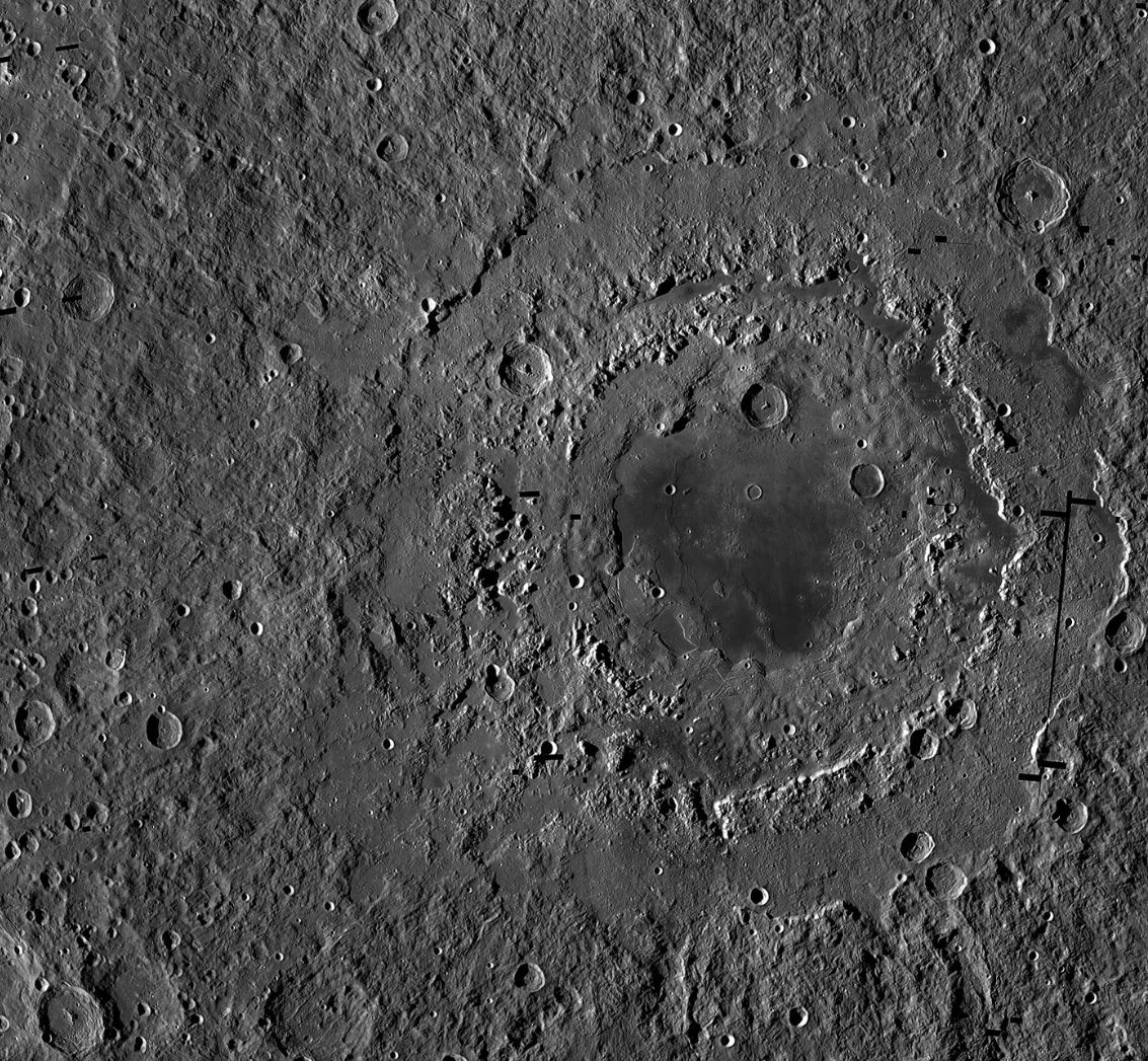 Orientale basin is about 930km wide and has three distinct rings, which form a bullseye-like pattern. This view is a mosaic of images from NASA’s Lunar Reconnaissance Orbiter. = Image Credits: NASA/GSFC/Arizona State University